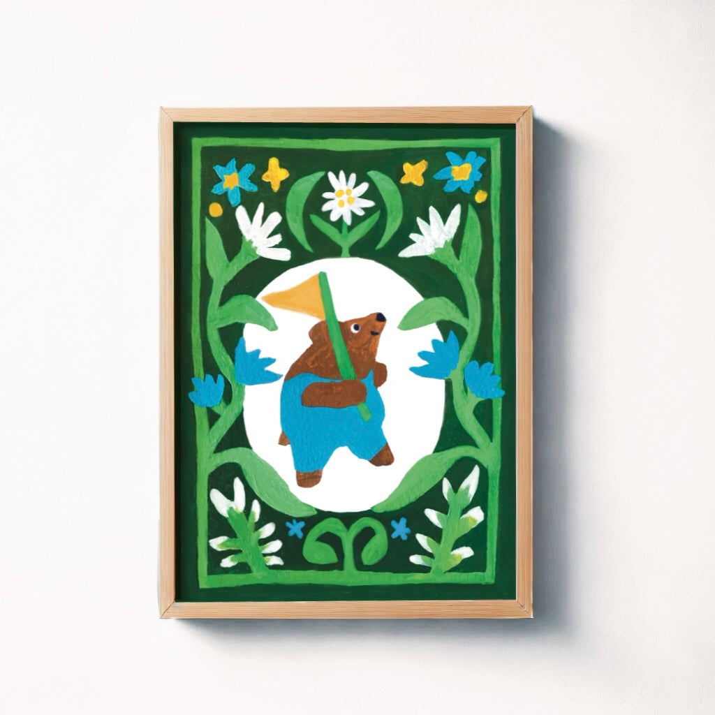 Inspired by storybooks this print is perfect for a little ones nursery or bedroom. Originally hand painted using acrylics by World Illustration Award winning illustrator Georgia Camden. This colourful and contemporary print, has a sweet bear holding a yellow flag surrounded by beautiful flowers and plants on a green background.