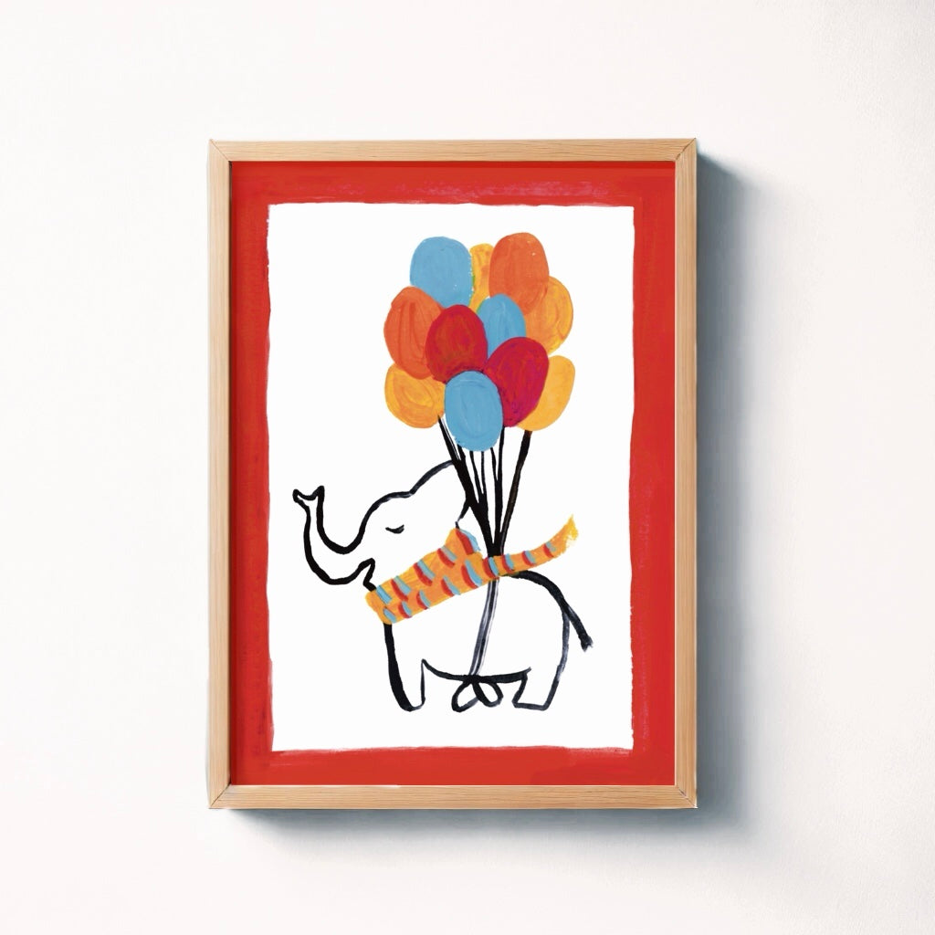 The perfect art print for providing a splash of colour in any child's room. This gorgeous handdrawn elephant is holding a bright bunch of colourful balloons. This print will help to add life to a space, bringing beauty and personality to your home décor by creating a focal point that will elevate the feel of a room.