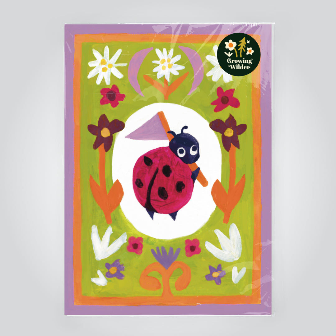 Inspired by storybooks this print is perfect for a little ones nursery or bedroom. Originally hand painted using acrylics by World Illustration Award winning illustrator Georgia Camden. This colourful and contemporary print, has a sweet little ladybird holding a purple flag surrounded by beautiful flowers and plants on a green and purple background.
