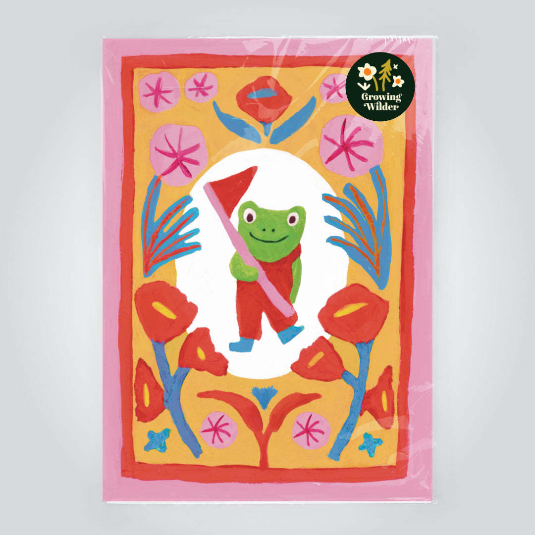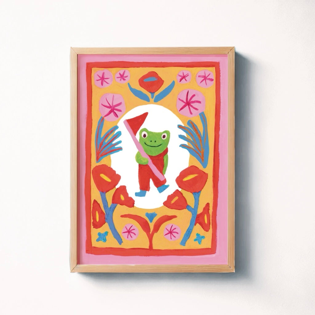 Inspired by storybooks this print is perfect for a little ones nursery or bedroom. Originally hand painted using acrylics by World Illustration Award winning illustrator Georgia Camden. This colourful and contemporary print, has a sweet frog holding a red flag surrounded by beautiful flowers and plants on a yellow and red background.