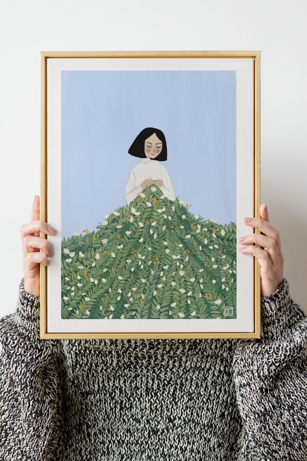 This illustration is about the beauty of conscious crafting, sustainable fashion, and our hopeful future. This is piece is part of a Women in Craft - Conscious Crafting series. A loving nod to all the crafters, makers, movers and shakers. To the mothers, daughters and sisters. To dear friends, fearless leaders and loving cheerleaders. In a world of loud voices, we can craft, see, make and create together to make the world a better place.