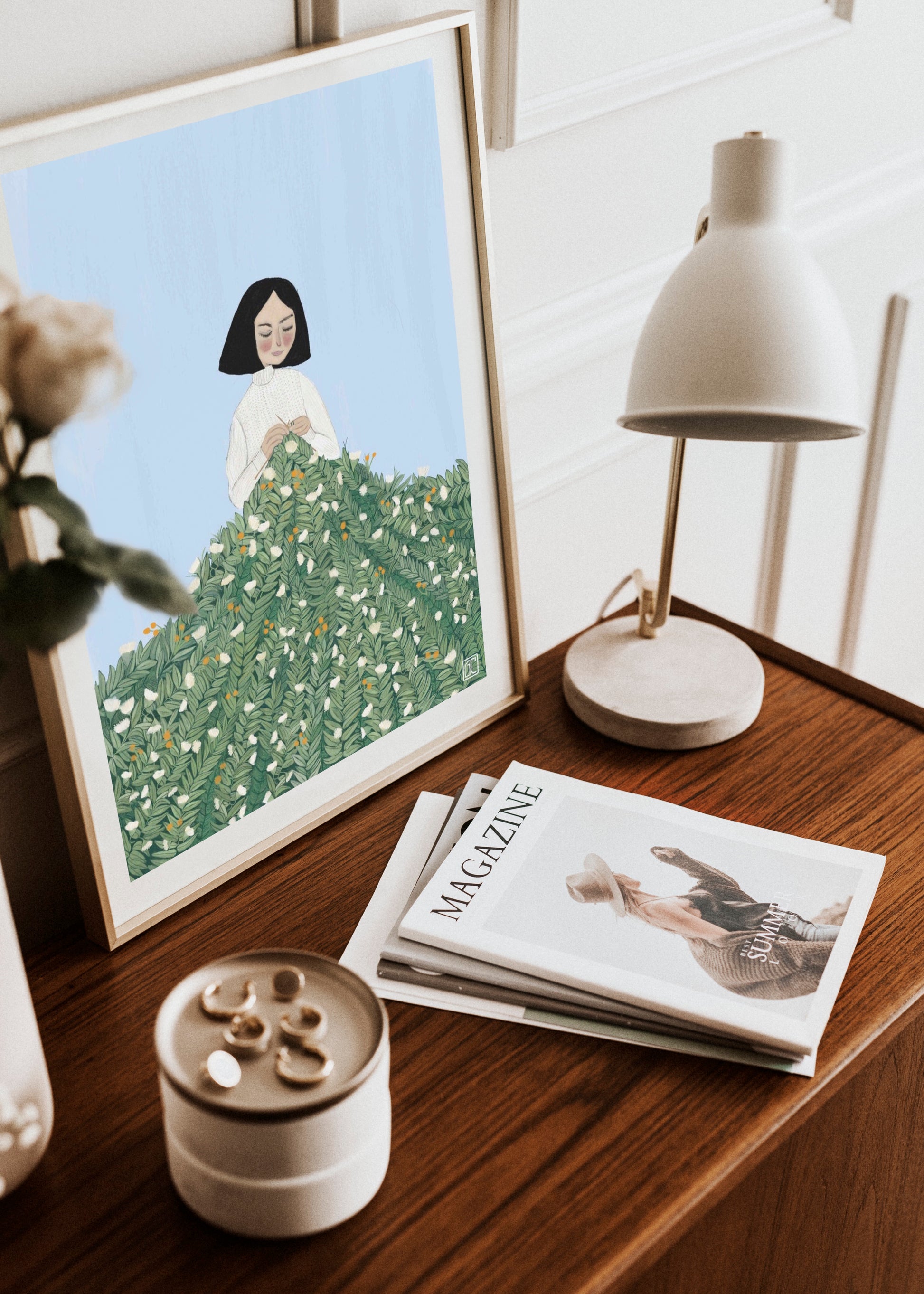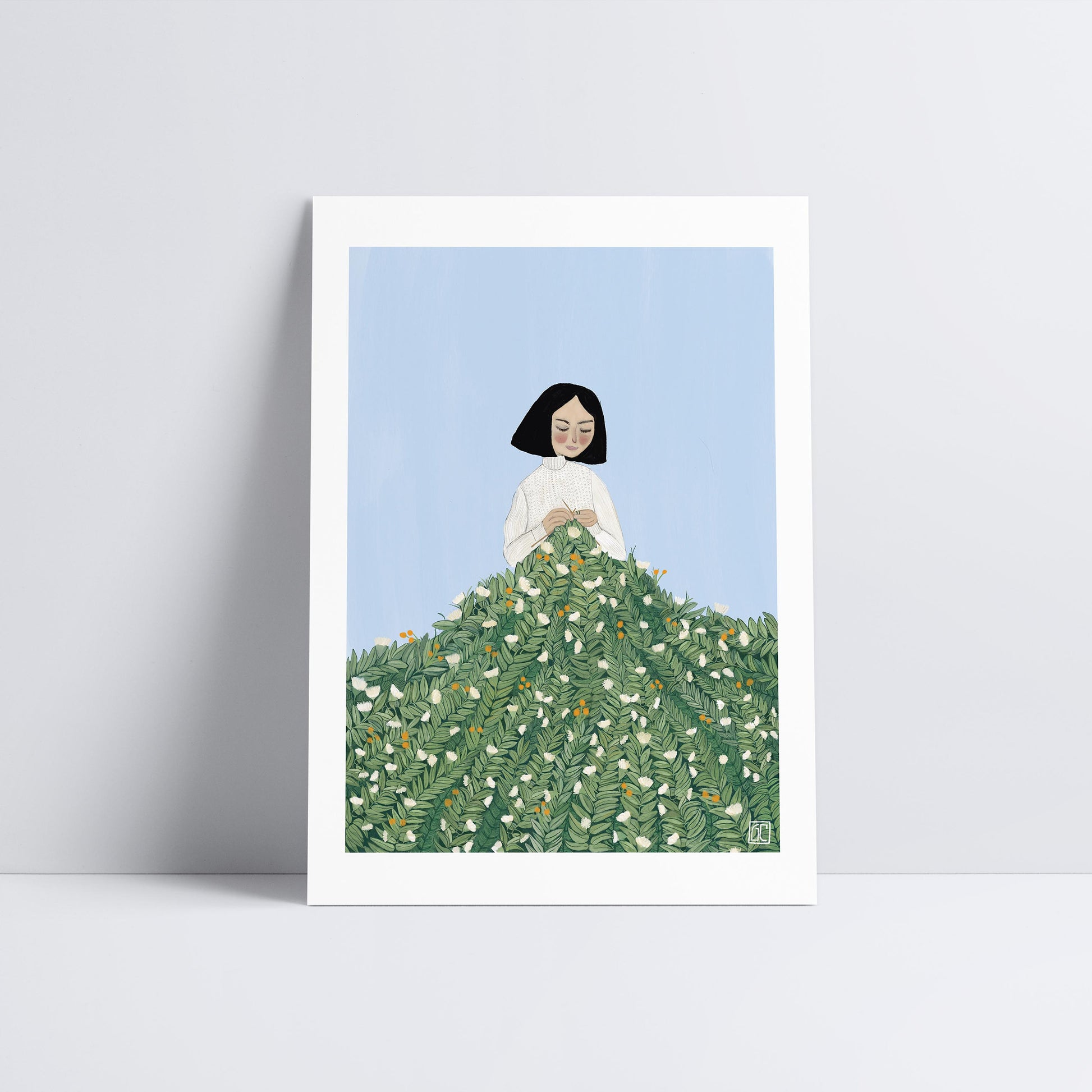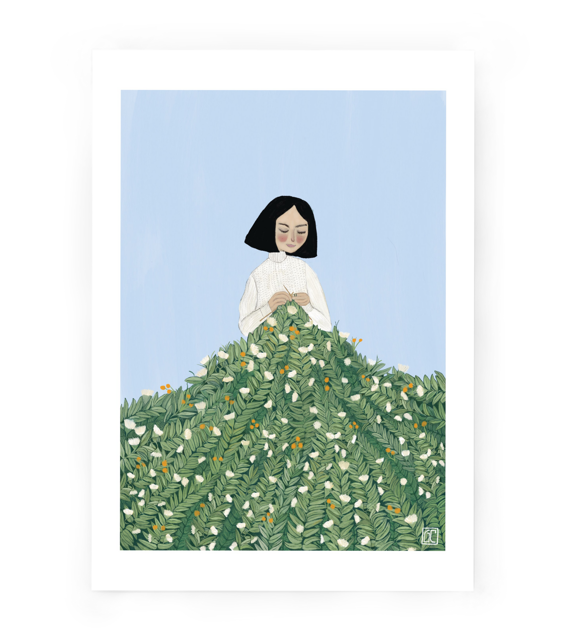 A loving knitter works on a blanket of flowers. The avid knitters will adore this print as a gift!