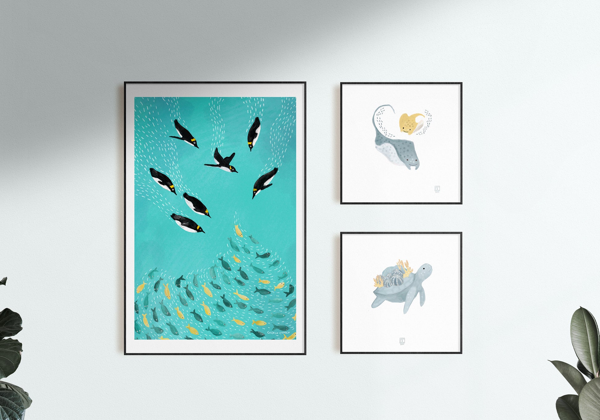 Penguins playing under the sea. Perfect for home decor or an ocean-themed gift for a marine biologist!