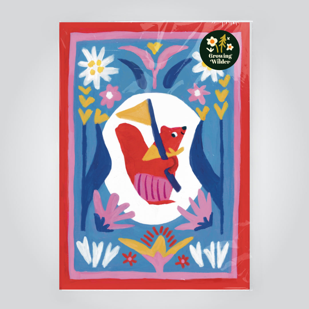 Inspired by storybooks this print is perfect for a little ones nursery or bedroom. Originally hand painted using acrylics by World Illustration Award winning illustrator Georgia Camden. This colourful and contemporary print, has a sweet little red squirrel holding a yellow flag surrounded by beautiful flowers and plants on a blue and red background.