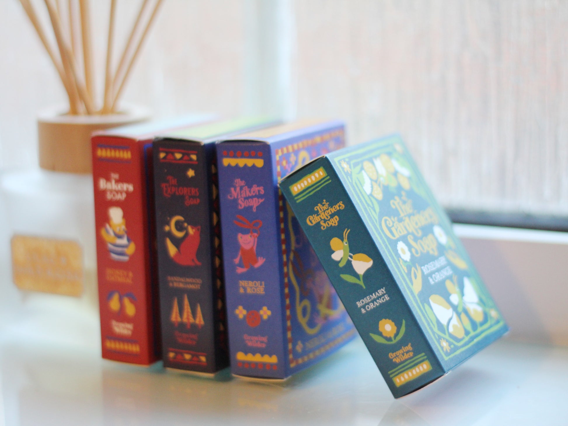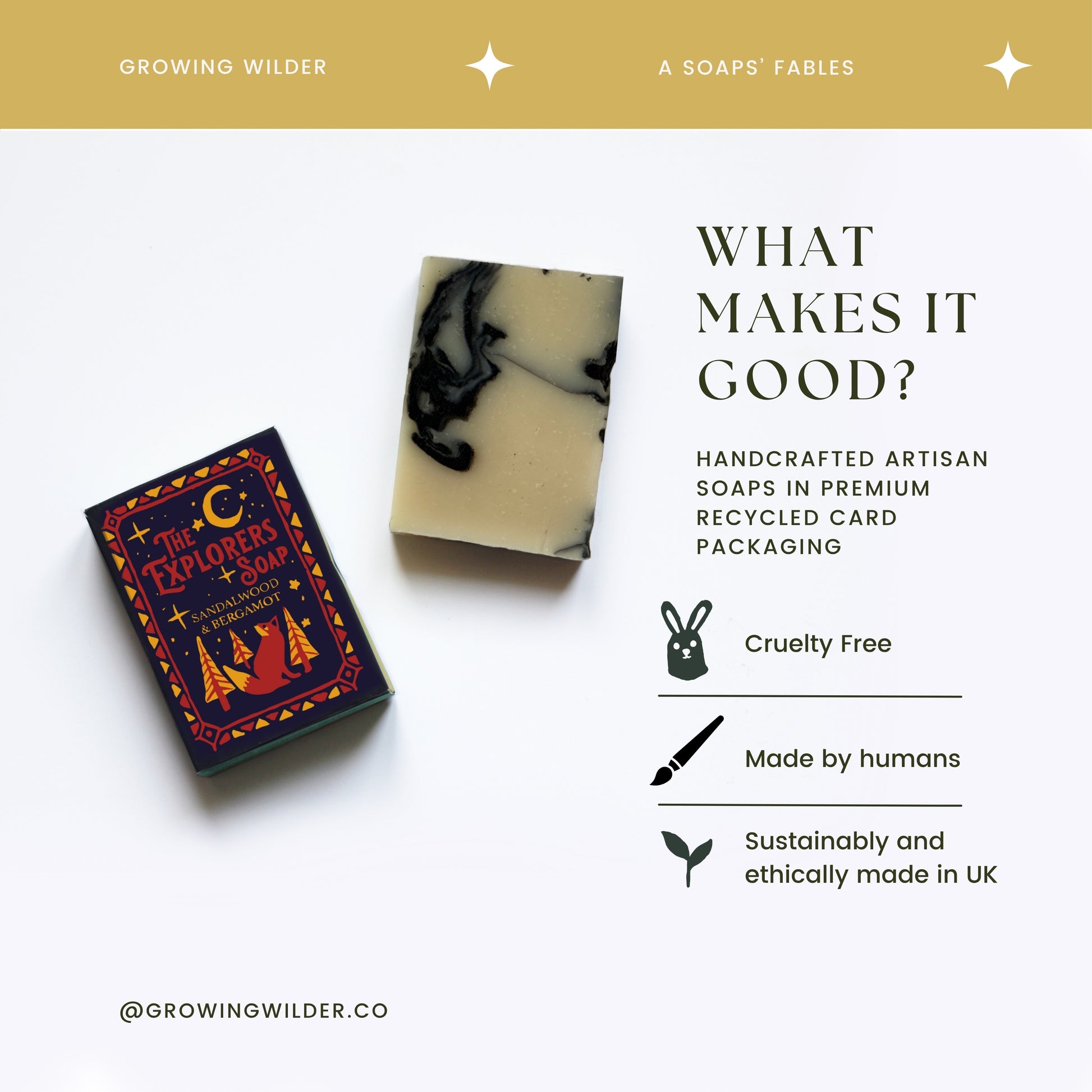 A 100g bar made in the UK with with Sandalwood and Bergamot. It is soft and smokey with a marbled finish. Wrapped in illustrated packaging by award-winning independent illustrator Georgia Camden.