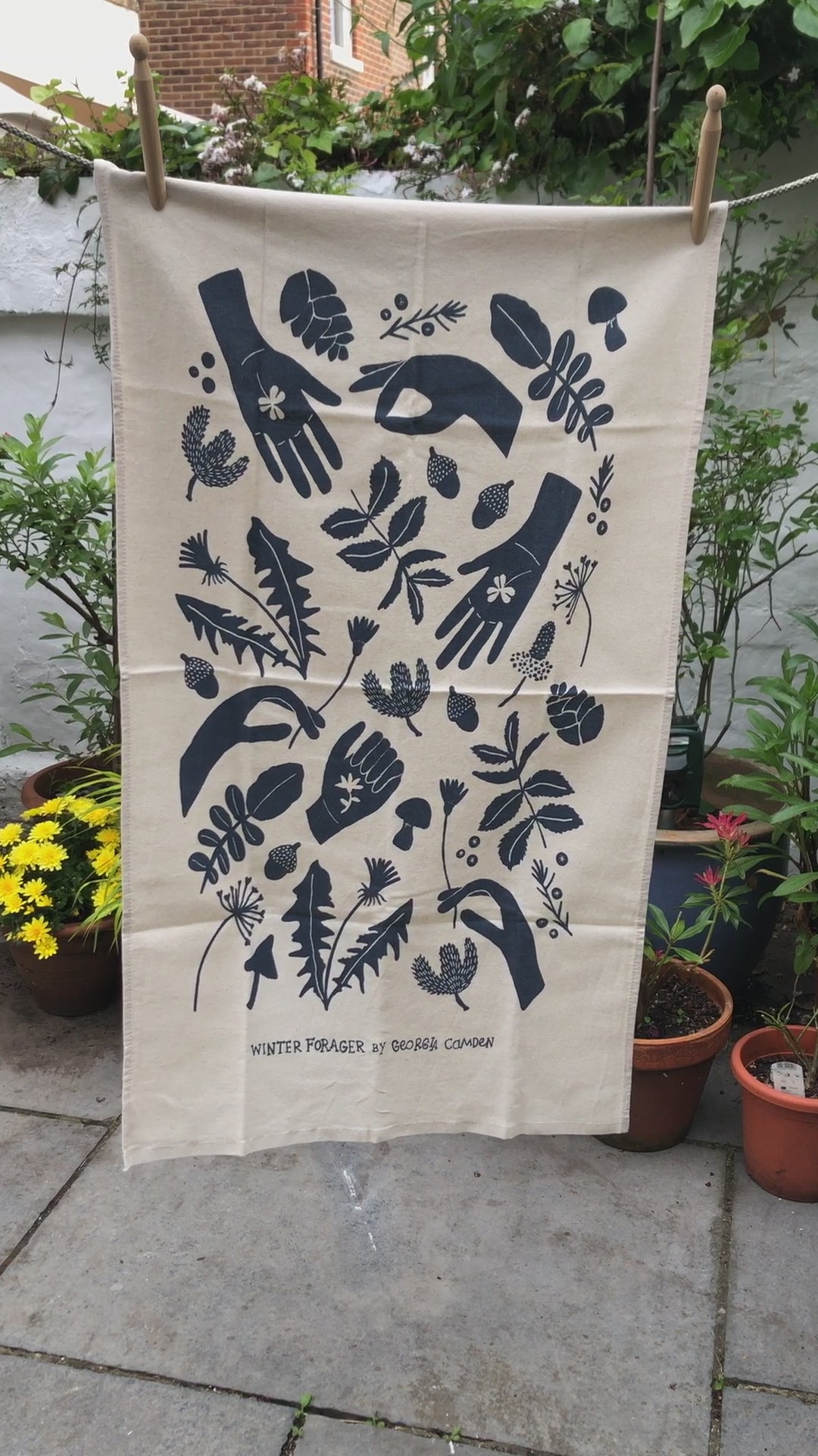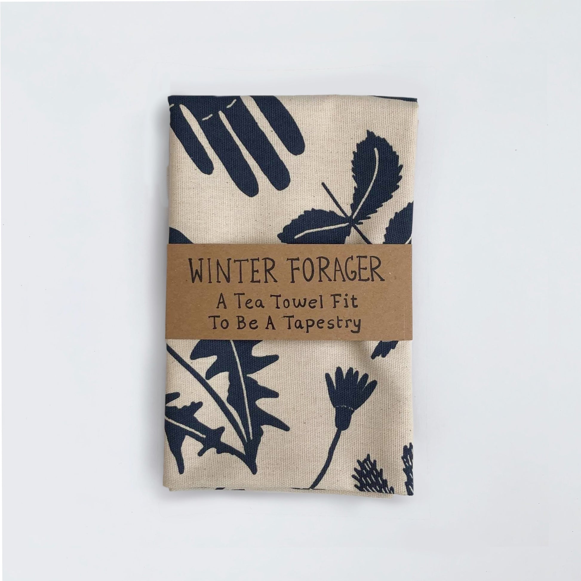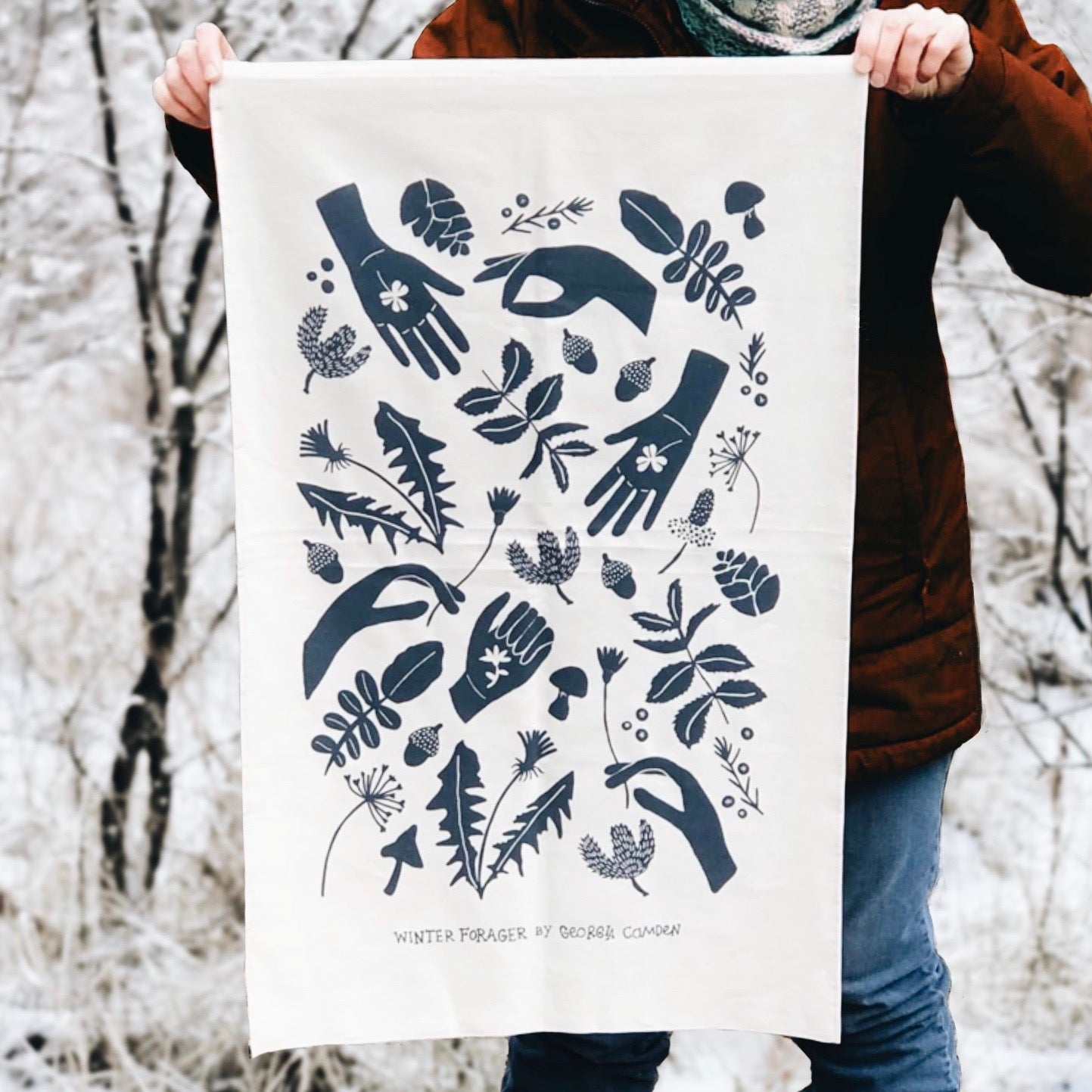 Winter Forager tea towel is inspired by our connection to nature, food and sustainability. It is part of a tea towel set focusing on the seasons and different foraging finds in each.